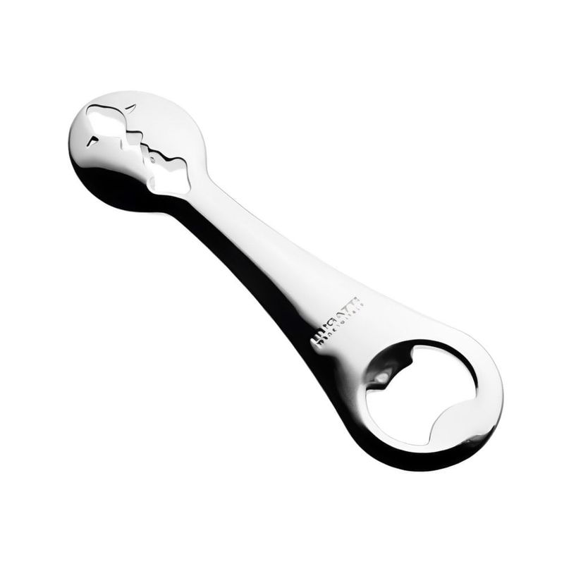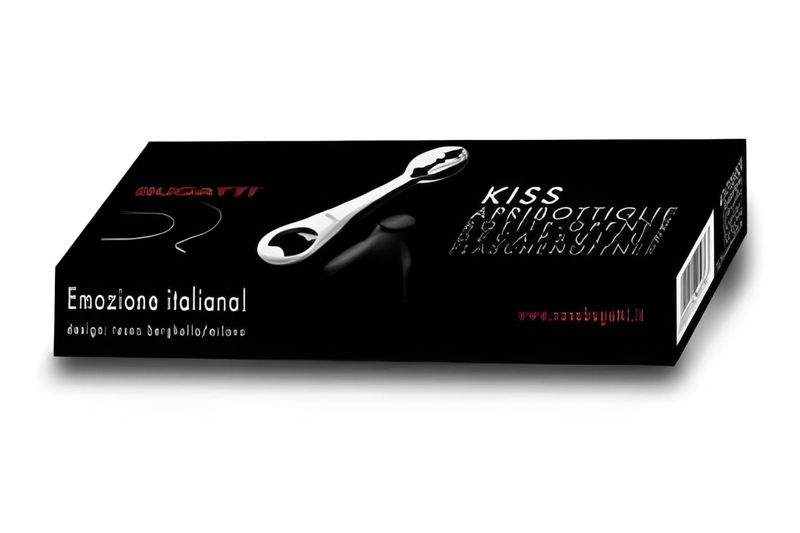 • Fabricado em zamak e aço inoxidável 18/10, distingue-se pelo seu formato icónico da linha Kiss, retratando as silhuetas de dois rostos prestes a se beijar.