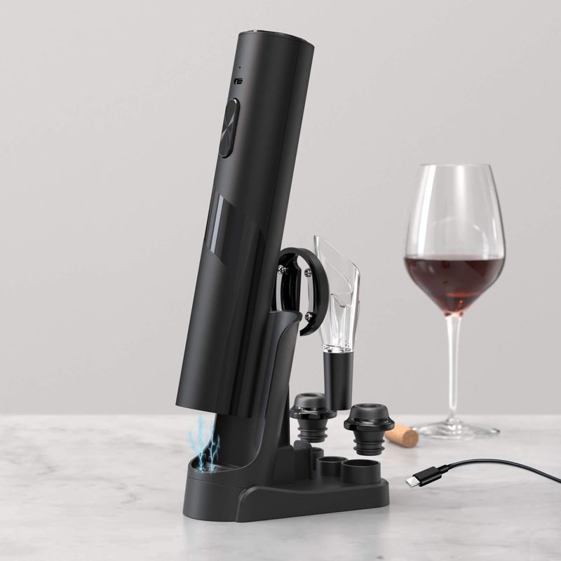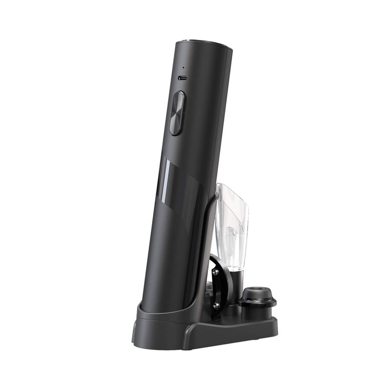 Esse kit abre garrafas de vinho de forma automática e também atua como bomba de vácuo para preservar a bebida por mais tempo. Compacto e elegante, ideal para quem aprecia vinhos e deseja um acessório prático, possuí um design moderno e sofisticado.