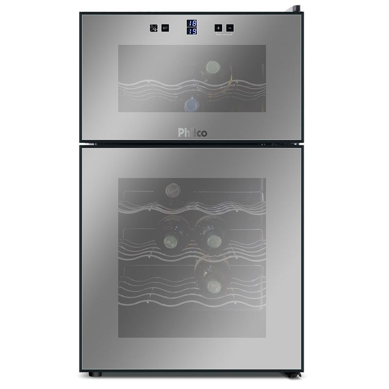 A Adega Philco 24 Garrafas Preta PH24DZ  mantém 24 garrafas na temperatura ideal para servir. Controle Eletrônico de temperatura para compartimento separados ajusta a temperatura entre 8ºC a 18ºC (compartimento superior) 12°C a 18°C (Compartimento inferior)