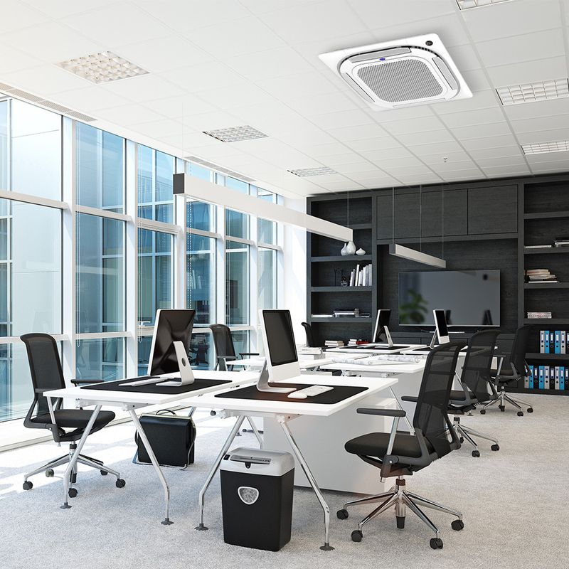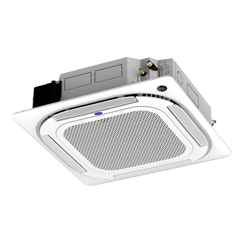 Ar Condicionado Split Cassete 4 Vias - Inverter R-32 - Connect - Carrier - 58.000 BTUs - Quente/Frio - 220V Monofásico O split Cassete Inverter Carrier é o equipamento ideal para quem precisa climatizar grandes ambientes residenciais, salas amplas e conjuntos comerciais com distribuição uniforme no ambiente. O sistema conta com a tecnologia de compressores de velocidade variável, que proporcionam grande economia de energia, e fluido refrigerante ecológico R-32. Diferenciais do ar-condicionado Split Cassete Inverter Carrier Bomba de Dreno incorporada Evita acúmulo de água na unidade interna e gotejamento. Operação ultra-silenciosa Ventilador interno com design de alta tecnologia que proporciona baixo nível de ruído. Painel frontal removível Facilita a manutenção e acesso aos componentes internos sem a necessidade de retirar o produto do teto ou forro. Função Eco Tecnologia com operação inteligente da unidade interna proporcionando maior economia de energia. Sistema de renovação de ar opcional Permite a troca constante de ar do ambiente, ar mais puro e saudável para todos os usuários. Display digital na unidade interna Facilita a leitura das informações e funções escolhidas, além da opção de desligar o display através do controle remoto, tornando o ambiente mais agradável a noite. Display digital no controle remoto Exibe o modo de operação e a temperatura desejada. Função Swing Distribuição uniforme de ar em todo o ambiente por meio de defletores laterais. 4 modos de funcionamento Resfria, desumidifica, ventila e aquece (função aquecimento disponível apenas em aparelhos quente e frio). 4 velocidades de ventilação Baixa, média, alta e automático. Timer ON/OFF Programa o horário para ligar e desligar. Conforto por todos os lados O novo Split Cassete Carrier possui um painel com saída de ar em 360° que otimiza a distribuição de ar pelo ambiente, aumenta o desempenho do aparelho e traz muito mais conforto.