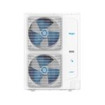 A unidade externa tem descarga horizontal, com condensador de cobre e aletas com proteção adicional azul que aumenta a vida útil do produto.
