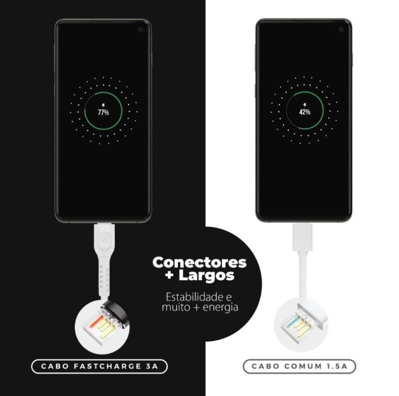 O cabo Dual Shock, da Gorila Shield, possui 1,2m de cabo revestido em PVC reforçado, proporcionando mais resistência e maior durabilidade ao acessório. Para quem possui aparelhos com a tecnologia Qualcomm 3.0, o Dual Shock é compatível. Para guardar o cabo de uma forma mais segura, prenda o acessório com a presilha Smart Arrange.