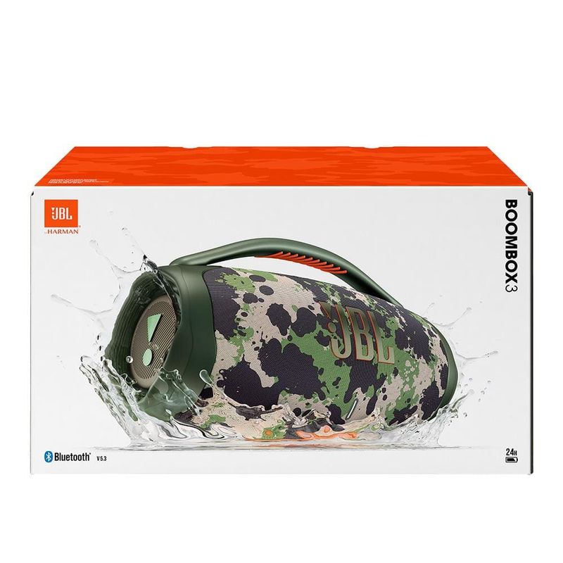 Experimente um som JBL Original pro Sound Desfrute de graves profundos e poderosos com a JBL Boombox 3. Seu design premium de três vias oferece uma experiência sonora imersiva, como se estivesse em um show ao vivo. Conectividade versátil Transmita música via Bluetooth em qualquer lugar. Troque facilmente entre as conexões para uma experiência de áudio perfeita, seja em casa ou ao ar livre, mantendo seu telefone sempre disponível. Bateria para o dia todo Leve sua música em todas as aventuras. Com até 24 horas de reprodução contínua, a JBL Boombox 3 acompanha você em festas na praia, churrascos no quintal e em qualquer viagem de família, mantendo a festa o dia todo. Design portátil e resistente Sua caixa robusta é projetada para resistir às aventuras mais agitadas. Leve-a consigo para qualquer lugar, desde o interior até a praia, sem se preocupar com quedas ou respingos.