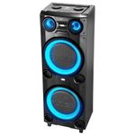 - Dois alto-falantes de 10” que garantem graves fortes e qualidade de som superior