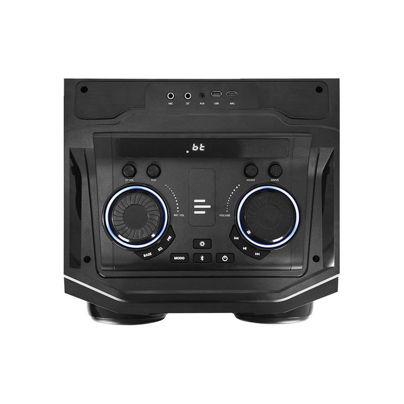 A conectividade é outro ponto forte: ouça suas playlists via Bluetooth, entrada USB, entrada HDMI, entrada auxiliar P2 (3,5 mm), ou conecte instrumentos e microfones diretamente por meio das entradas dedicadas — tudo com praticidade e rapidez. O modo microfone permite transformar qualquer ambiente em um palco, seja para cantar, animar o público ou fazer apresentações.
