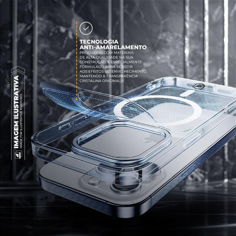Transparência cristalina: material acrílico de alta resistência que mantém o visual original do iPhone por muito mais tempo.