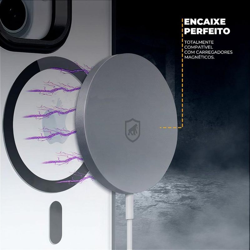A Capa Airbag da Gshield também se destaca por sua compatibilidade com carregadores magnéticos, como os da tecnologia MagSafe, proporcionando uma experiência de recarga rápida e eficiente, sem a necessidade de remover a capa. Para maior conveniência, a alça kickstand integrada ao redor da câmera protege contra impactos e evita o contato direto das lentes com as superfícies, eliminando o risco de arranhões. Além da segurança, ele funciona como um prático suporte, permitindo que você posicione seu iPhone na horizontal, uma posição ideal para assistir vídeos, realizar videochamadas ou visualizar conteúdos com maior conforto e praticidade.