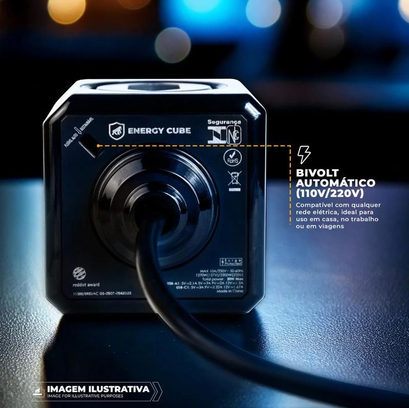 Desenvolvido para entregar alto desempenho com total segurança, o Energy Cube conta com entrada bivolt automática (110V~220V), proteção contra sobrecarga e tomadas com trava de segurança interna, garantindo tranquilidade tanto para o uso adulto quanto infantil.