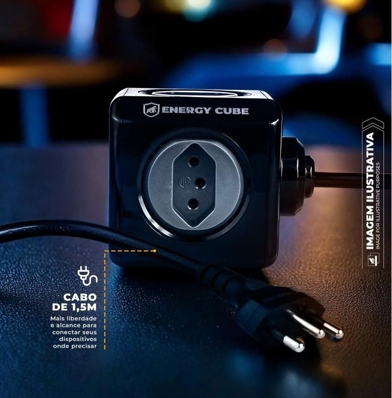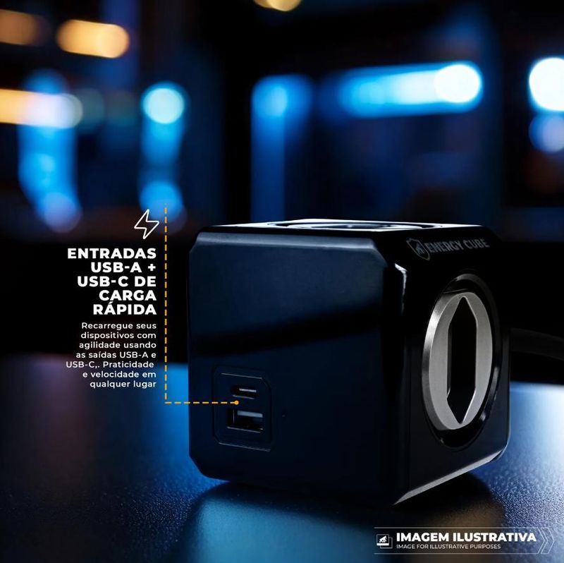 Carregador Adaptador Bivolt Energy Cube - Preto - Entrada USB-A + Tipo C + 4 Tomadas com Cabo 1,5M