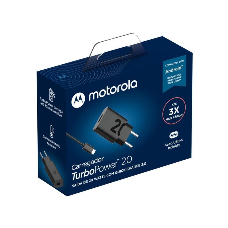 Carregamento Turbopower até 3x mais Rápido Carregador de parede Motorola TurboPower 20W equipado com a tecnologia Qualcomm Quick Charge 3.0, ele proporciona até 3 vezes mais velocidade do que um carregador convencional, recarregando seu dispositivo em apenas alguns minutos. Compatibilidade USB-C com potência turbo de 20W A entrada USB-A universal e o cabo com saída USB-C garantem compatibilidade com uma ampla variedade de smartphones e outros dispositivos. Certificado conforme os mais rigorosos padrões de eficiência energética, o carregador Turbo 20W fornece energia de maneira estável e segura, protegendo seu dispositivo contra sobrecarga e superaquecimento. Tenha a tranquilidade de saber que você sempre estará conectado quando mais precisar com o Carregador Motorola.
