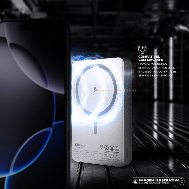 Com capacidade de 10.000mAh, o Titanium garante energia de sobra para manter seus dispositivos sempre ativos, mesmo nas rotinas mais intensas. Seu diferencial está na compatibilidade com o sistema MagSafe, que proporciona um encaixe magnético firme, seguro e sem esforço em iPhones e outros dispositivos compatíveis com tecnologia magnética.