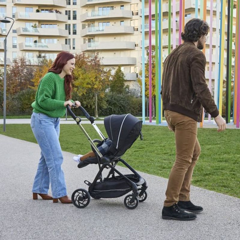 Versátil e funcional, o carrinho se transforma facilmente em um sistema de viagem quando combinado com o bebê conforto Kory Essential, utilizando os adaptadores que já acompanham o produto. Além disso, possui capa de chuva inclusa, garantindo proteção em qualquer clima e segurança para o bebê.