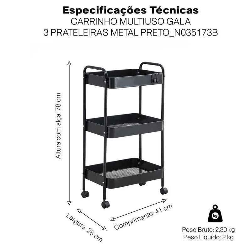 Carrinho Multiuso Gala com 3 Prateleiras – Metal Preto