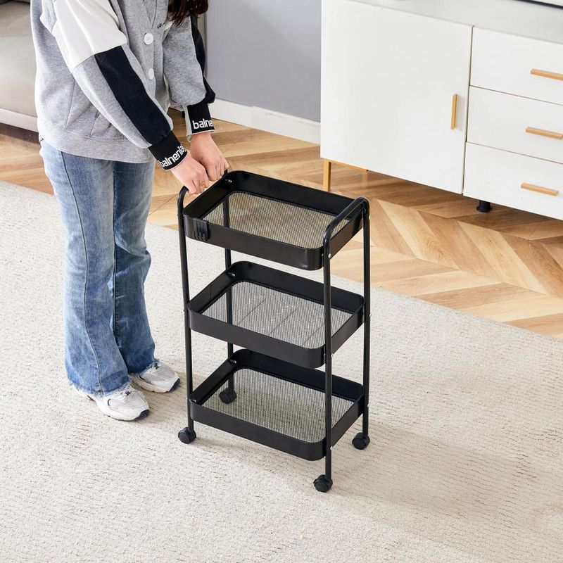 Com dimensões compactas, este carrinho é especialmente projetado para otimizar espaço, contando com três amplas prateleiras que tornam a arrumação muito mais fácil. As rodinhas proporcionam fácil locomoção, permitindo que você leve o carrinho de um lugar para outro sem esforço. As prateleiras em grade de ferro não apenas oferecem robustez, mas também facilitam a limpeza, garantindo um aspecto sempre impecável.