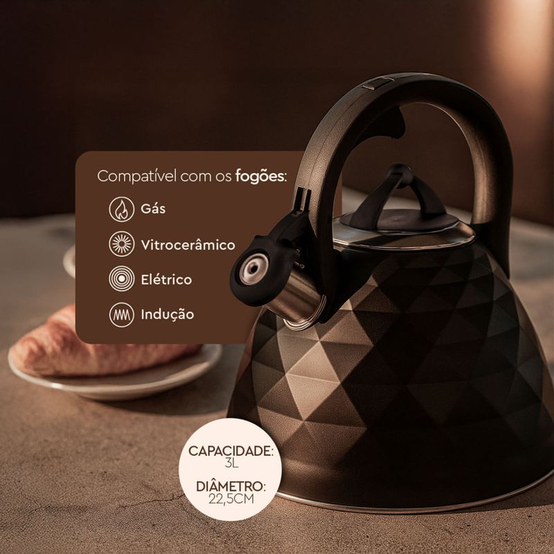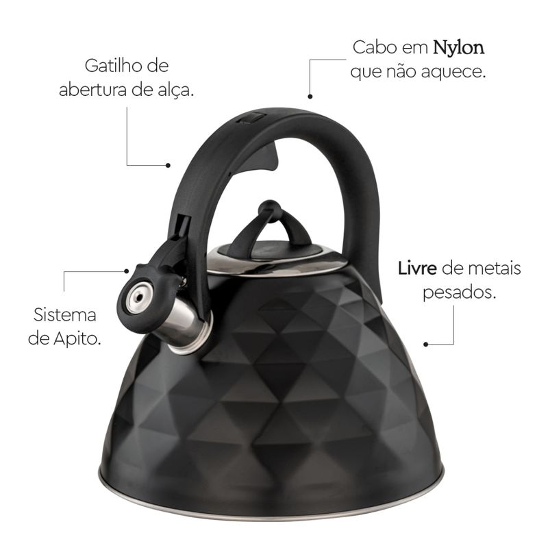 Diferenciais:Capacidade de 3 litrosApito sonoro que sinaliza quando a água ferveFundo de indução: compatível com todos os fogõesCabo de baquelite antitérmico: segurança no manuseioAço inoxidável: durável, higiênico e livre de toxinasRevestimento externo preto fosco com acabamento siliconadoDesign elegante e contemporâneo