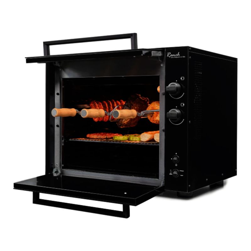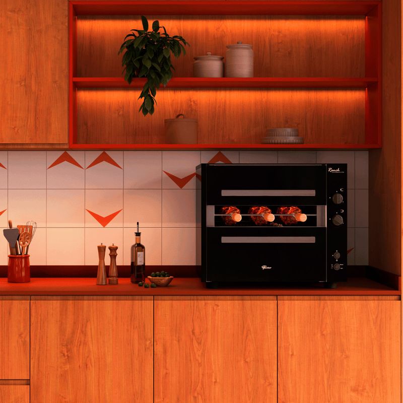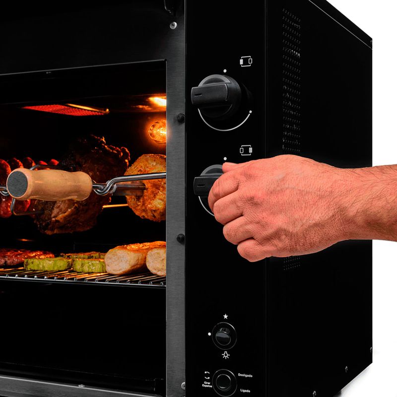 A Churrasqueira a Gás de Bancada Fischer Ranch 3 Espetos foi desenvolvida para quem busca praticidade e alto desempenho no preparo de churrascos. Compacta e elegante, se adapta facilmente a bancadas e áreas gourmet, oferecendo estilo e eficiência. Conta com três espetos rotativos automáticos, sendo dois simples e dois duplos, que garantem assados suculentos e homogêneos sem necessidade de girar manualmente. O acendimento automático facilita o uso, enquanto os queimadores infravermelhos individuais distribuem o calor de forma uniforme, proporcionando agilidade no preparo das carnes. Equipada com portas superior e inferior que ajudam a reter o calor, a churrasqueira assegura um cozimento uniforme e mais saboroso. A lâmpada interna oferece visibilidade durante o uso e o revestimento EasyClean torna a limpeza prática e rápida. Para maior segurança, possui válvula corta-gás integrada. Entre suas especificações técnicas, destaca-se a tensão bivolt 127V/220V, dois queimadores de 2250 Kcal, lâmpada de 25W, três espetos rotativos, grelha com quatro níveis de altura, revestimento interno EasyClean, acabamento externo preto com vidro frontal, manipuladores em termoplástico, compatibilidade com GLP ou GN e consumo de 380 g/h (GLP). Com dimensões de 540x652x612 mm e peso de 26 kg, é a escolha ideal para transformar seu churrasco em um momento de sabor e praticidade.