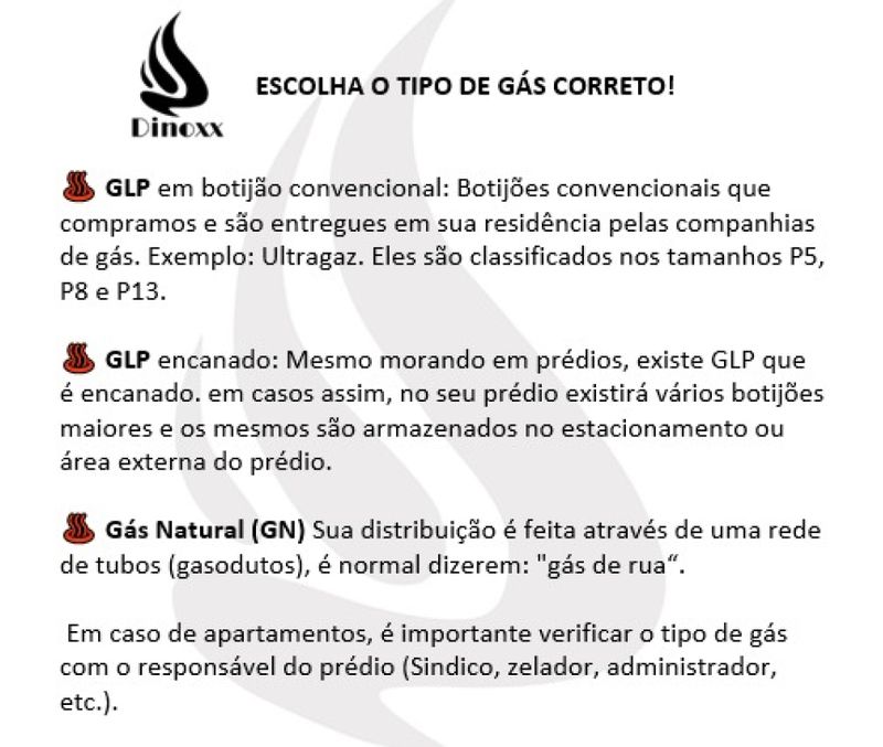Pressão de trabalho do queimador: GLP botijão 2,8 Kpa - GLP encanado 2,5 Kpa - GN encanado 1,25 Kpa;