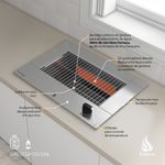 100% em aço inox sendo: Aço inox 304: Grelha Aço inox 430: Estrutura, Cocho, tampo, bandeja coletora de gordura; 02 queimadores a gás infravermelho (geração de energia por queimador 2250 Kcal/h); 01 botão com regulagem de temperatura do queimador; Pressão de trabalho do queimador: GLP botijão 2,8 Kpa - GLP encanado 2,5 Kpa - GN encanado 1,25 Kpa; Bicos injetores com Ø de 1,00mm gás GLP e 1,4mm gás GN; Sistema Safe Stop (Válvula de segurança corta gás); Acendimento manual (Isqueiro).
