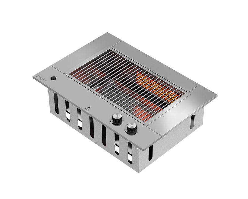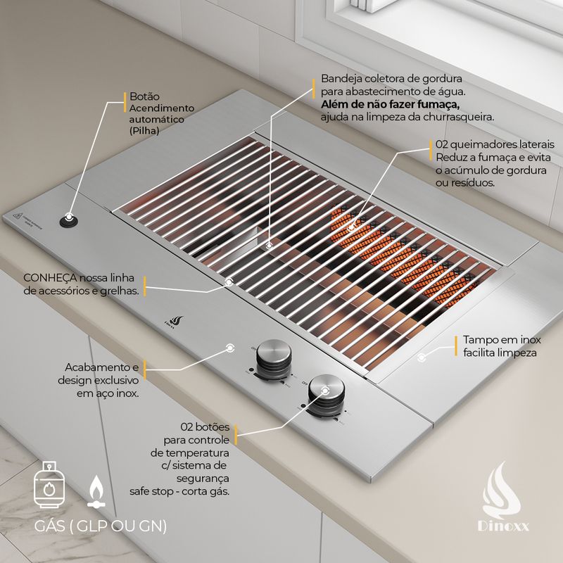 100% em aço inoxAço inox 304: Grelhas, tampo, bandeja coletora de gordura; Aço Inox 430: Cocho; 02 queimadores a gás infravermelho (geração de energia por queimador 2250 Kcal/h); 02 botões com regulagem de temperatura do queimador; Pressão de trabalho do queimador: GLP botijão 2,8 Kpa - GLP encanado 2,5 Kpa - GN encanado 1,25 Kpa; Bicos injetores com Ø de 1,00mm gás GLP e 1,4mm gás GN; Sistema Safe Stop (Válvula de segurança corta gás); Acendimento automático (Pilha). MEDIDAS DA CHURRASQUEIRA: