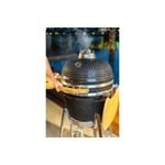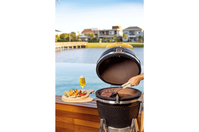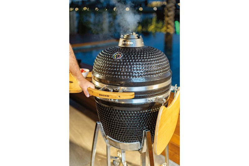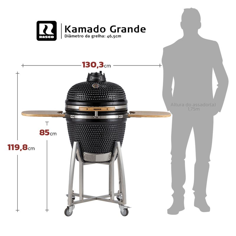 O Kamado Grande é uma churrasqueira premium ideal para um servir até 15 pessoas. Ela Grelha, Sela, Defuma e Assa: prepare desde o churrasco tradicional na grelha até um festival da Pizza ou Hambúrguer. O Kamado da Rasco utiliza pouquíssimo carvão e, por isso, produz POUCA FUMAÇA. Sua estrutura refratária com isolamento oferece máxima retenção de calor, necessitando de menos combustão para atingir e manter a temperatura desejada que pode ser acompanhada no termômetro embutido. Acender o carvão é rápido e fácil devido ao adequado suprimento de oxigênio e a temperatura ideal é alcançada em instantes. Além disso, o carvão excedente pode ser aproveitado no próximo churrasco. Fácil de Limpar: além de ser autolimpante, basta remover as cinzas através da porta frontal. Produzida com materiais de alta durabilidade e resistência como Cerâmica Refrária, Pintura Premium resistente às ações do clima, Aço Inox, madeiras em bambu antibacteriano e Ferro Fundido.