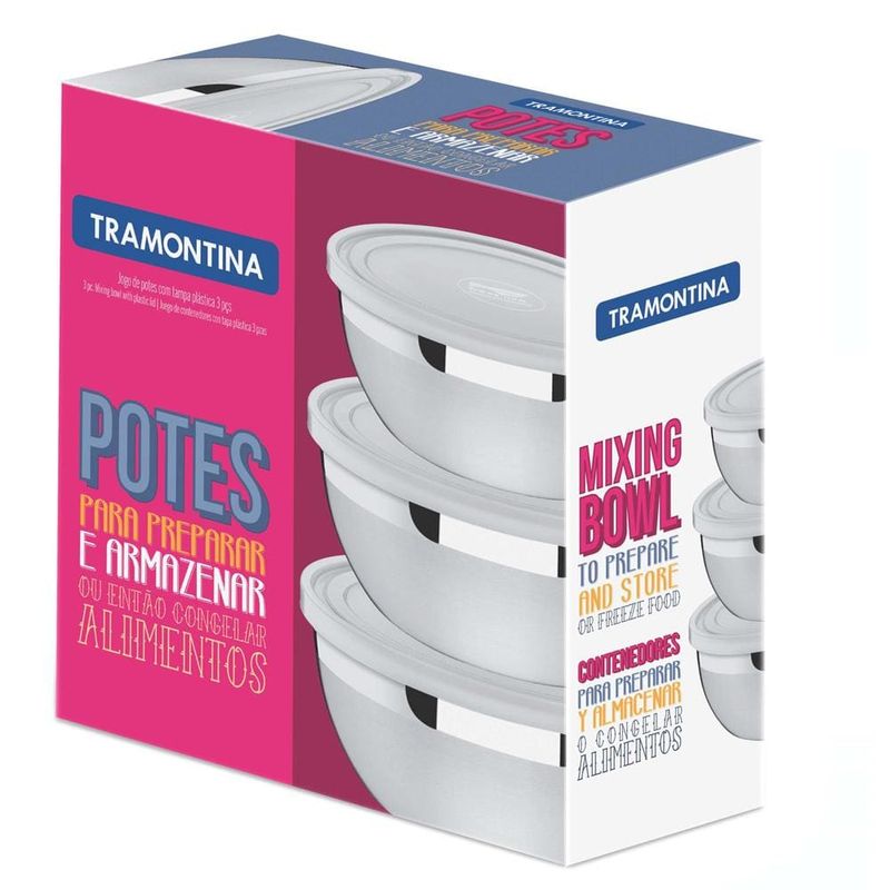 Com o Conjunto de Potes Tramontina sua cozinha fica mais completa e prática!Ele é formato por três potes de capacidades distintas (160 ml, 219 ml e 290 ml), confeccionados em aço inox altamente durável e resistente. Contam com design moderno, acabamento fosco e detalhes em brilho. As tampas de plástico oferecem vedação perfeita e melhor conservação dos alimentos. Além disso, também podem ser usados para preparar e servir todos os tipos de refeições.