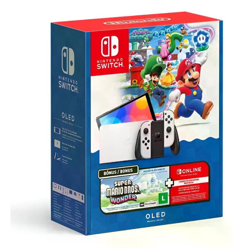 Acompanha o jogo Super Mario Bros Wonder (versão digital) e 12 meses de Nintendo Switch Online, perfeito para jogar com amigos, acessar partidas online e aproveitar conteúdos exclusivos.