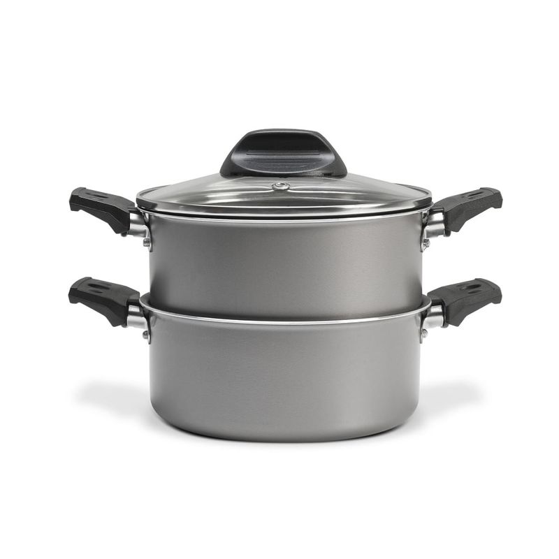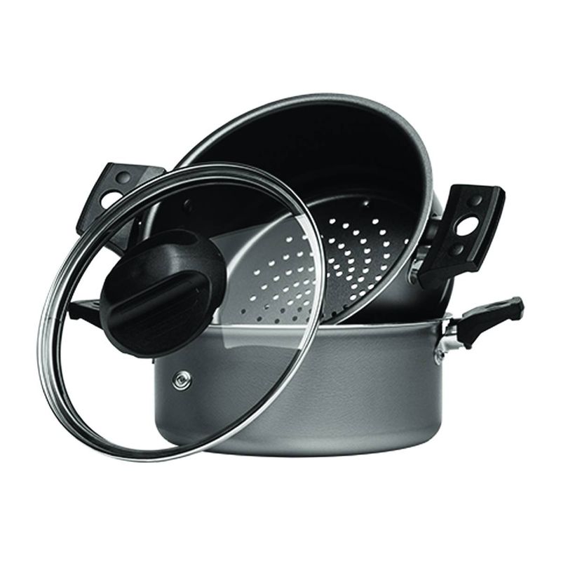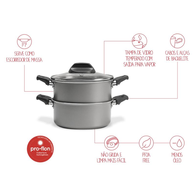 Principais benefícios:4 em 1: caçarola, cuscuzeira, escorredor e cozi-vaporeCozimento no vapor: preserva sabor, textura e nutrientesAntiaderente Pro-Flon: não gruda, usa menos óleo e limpa fácilPFOA free: mais segurança no preparo das refeiçõesAlumínio: aquecimento rápido e cozimento uniforme1,45 L: ideal para porções do dia a diaCor grafite: sóbria e cheia de estiloCompatível com fogões: gás, elétrico e vitrocerâmicoInmetro: classificação A de antiaderência (OCP 0070 | registro 000888/2021)