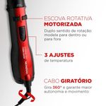 Escova Rotativa com 50 MM de diâmetro de rotação para os dois lados, perfeita para secar enquanto alisa e modela o cabelo. Bocal Direcionador - Concentra e direciona o fluxo de ar facilitando a secagem. Cabelos secos com acabamento natural em poucos minutos.