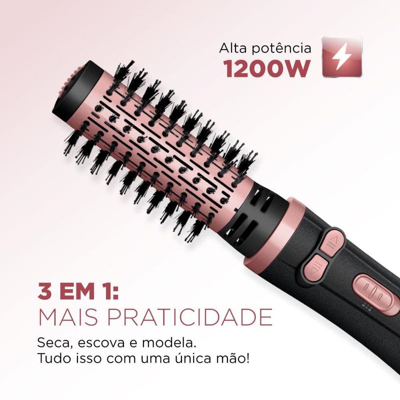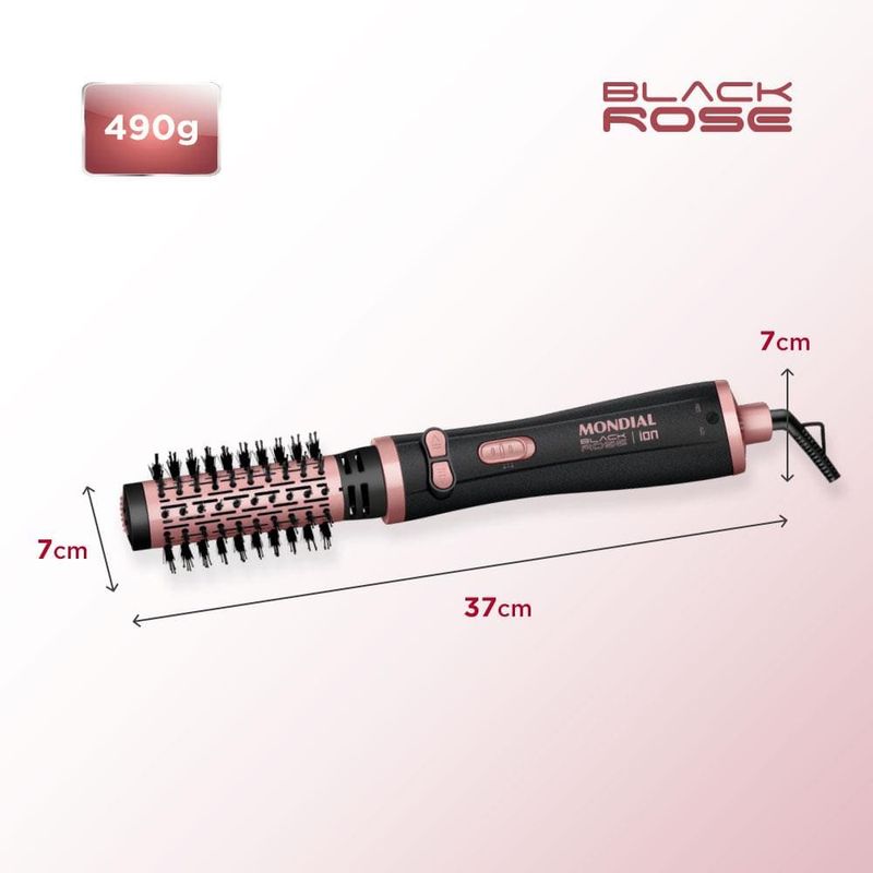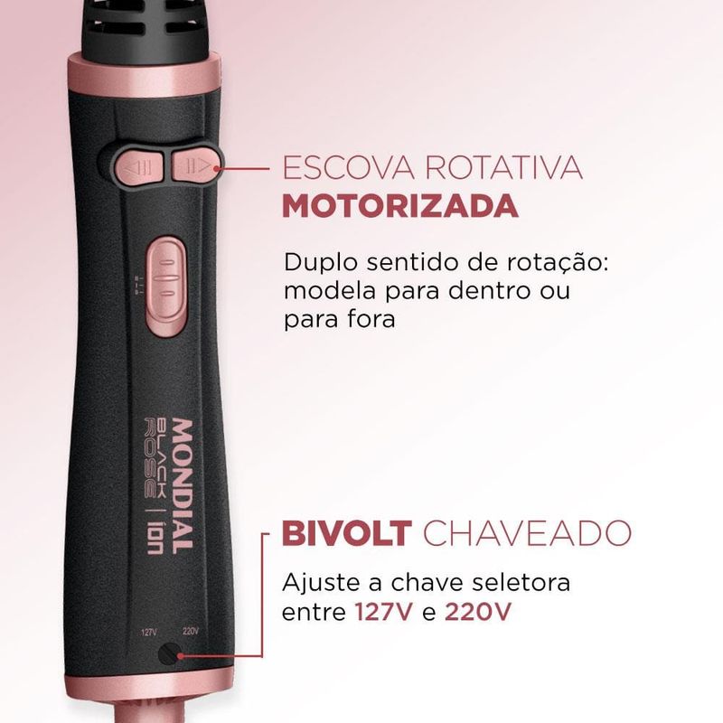 Você busca um cabelo com resultado de salão sem sair de casa? E o melhor: com um produto prático e fácil de manusear! A Escova Rotativa Mondial Black Rose ERB-01 é a garantia de fios lisos, modelados e bem cuidados. Revestimento Cerâmico com TOURMALINE ÍON emite íons que selam a cutícula das mechas, eliminam aqueles incômodos fios arrepiados e proporcionam mais brilho e maciez. A Escova Rotativa tem 1200W de Potência: Potência de secador com a praticidade de uma escova; Com duplo sentido de rotação ela: Modela o cabelo para dentro ou para fora; 2 ajustes de temperatura e ar frio: Proporcionam melhor desempenho durante a modelagem; Você seca, alisa e modela o cabelo ao mesmo tempo. Muita praticidade com uma única mão.Super Fácil de usar: Selecione a temperatura desejada e escove os cabelos da raiz até as pontas acionando o botão de rotação para modelar; Secagem rápida com resultados de salão.