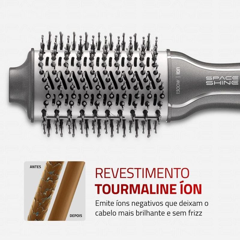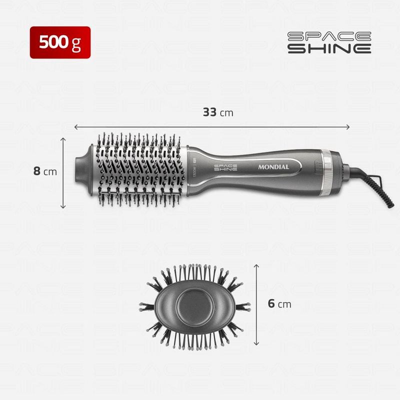 Escova Secadora Mondial Space Shine ES-20: Hiper Brilho e Praticidade para Cabelos Curtos e Franjas!Descubra a liberdade de ter cabelos perfeitamente modelados e com hiper brilho em qualquer lugar com a Escova Secadora Space Shine ES-20 da Mondial. Seu design slim e moderno foi especialmente pensado para oferecer precisão na modelagem de cabelos curtos, franjas e finalizações delicadas, tornando-se sua aliada indispensável no dia a dia e em viagens.A tecnologia avançada da Space Shine trabalha para realçar a beleza dos seus fios: o Revestimento Cerâmico com Tourmaline Íon distribui o calor uniformemente, libera íons negativos que selam as cutículas, reduzindo o frizz e proporcionando um brilho radiante e duradouro. Com 1.300W de potência, você garante uma secagem e modelagem rápidas e eficazes, transformando sua rotina de cuidados.Compacta, leve e com Bivolt Chaveado, a ES-20 te acompanha para onde você for, com a liberdade de usar em qualquer tomada (127V ou 220V). Escolha entre as 3 opções de temperatura para o resultado ideal, e desfrute da segurança e conforto que a ponta fria e o cabo giratório 360º oferecem. Além disso, as cerdas duplas especiais e o exclusivo suporte de apoio garantem a durabilidade e a performance do seu aparelho. Mondial: a escolha inteligente para brilhar!Características e Vantagens Exclusivas: Hiper Brilho e Redução de Frizz: Tecnologia Tourmaline Íon e Revestimento Cerâmico selam as cutículas, entregando cabelos radiantes, macios e sem frizz. Design Slim e Compacto: Ideal para modelar cabelos curtos, franjas e para levar em viagens. Leveza e praticidade. Potência de 1.300W: Secagem e modelagem rápidas e eficientes para otimizar seu tempo. Cerdas Duplas Especiais: Mais resistentes, duráveis e firmes para alisar e modelar com precisão.