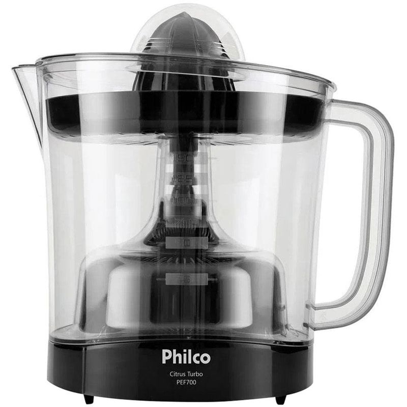 Acompanha 2 cones para extração, um para frutas maiores como laranja, e outro para frutas menores como limão. Sua jarra tem 1,5L de capacidade, permitindo preparar grandes quantidades de bebida de uma só vez.