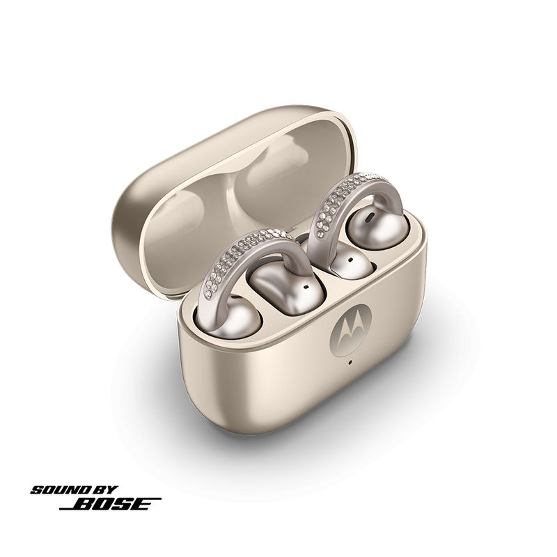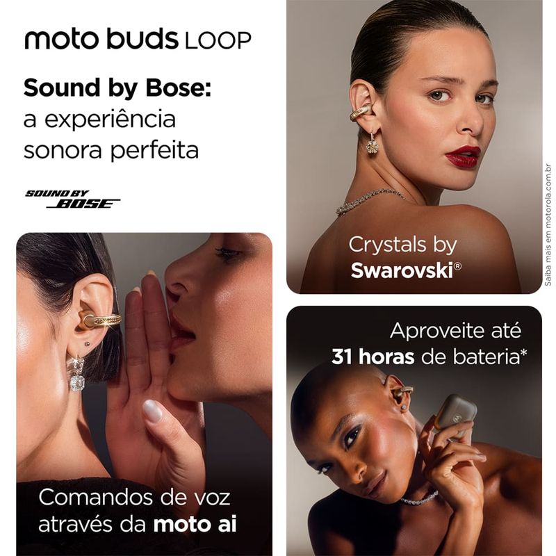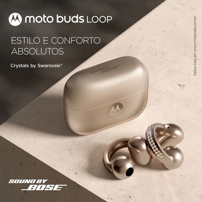 O Fone de Ouvido Moto Buds Loop Swarovski foi desenvolvido para oferecer conforto, estilo e qualidade sonora premium no seu dia a dia. Com design moderno e compacto, ele combina leveza com tecnologia de ponta para uma experiência completa. Equipado com Spatial Audio, tecnologia Sound by Bose e EVO, o Moto Buds Loop entrega som envolvente e equilibrado, perfeito para música, chamadas e entretenimento. Sua resistência à água com certificação IP54 nos earbuds e IPX2 no case garante maior durabilidade no uso diário.A autonomia impressiona: são até 8 horas de reprodução contínua, com mais 31 horas no estojo de carregamento, totalizando até 39 horas de uso. Leve e ergonômico, cada earbud pesa apenas 6,21g, enquanto o estojo com os fones juntos pesa 52.48g, proporcionando praticidade para levar a qualquer lugar. Com conectividade Bluetooth, microfone integrado e controle de volume, o Moto Buds Loop garante chamadas nítidas e fácil operação. Um acessório indispensável para quem busca qualidade de áudio, mobilidade e estilo. Os fones de ouvido Open Wearable Stereo (OWS) foram projetados para permitir que você ouça músicas ou podcasts sem isolar você do ambiente. Com essa tecnologia, você pode desfrutar de um áudio nítido e de alta qualidade enquanto permanece totalmente ciente dos sons ao seu redor, o que é ideal para manter a segurança durante atividades como esportes, exercícios ao ar livre e até mesmo no dia a dia.