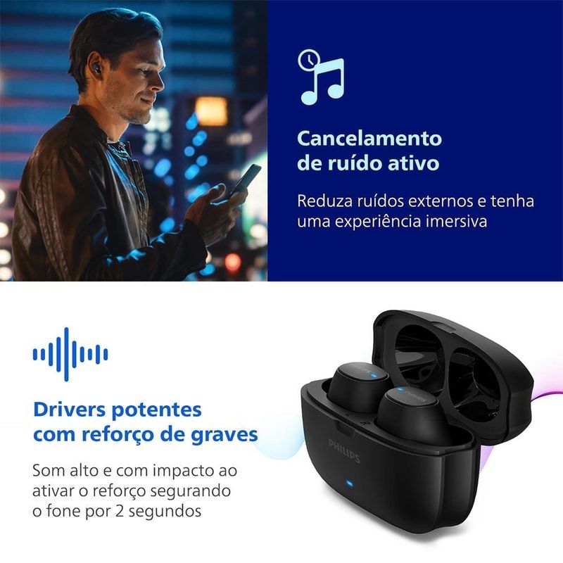 Fone de Ouvido Intra-Auricular True Wireless Philips TAT2500BK/00 - Une qualidade sonora, conforto e praticidade em um design compacto e moderno!