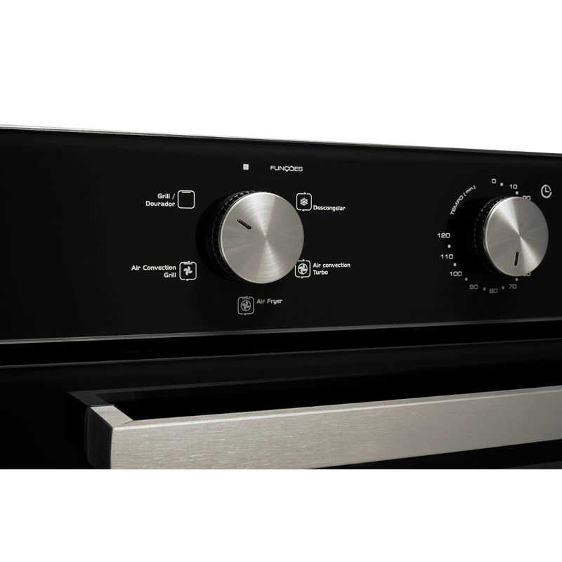 O Forno Elétrico de Embutir Fischer Infinity 50L com Air Fryer oferece praticidade, tecnologia e um design moderno que integra perfeitamente à cozinha. Com capacidade de 50 litros e controle de temperatura entre 50 °C e 300 °C, permite preparar receitas variadas com precisão. Traz função Air Fryer integrada, que garante alimentos crocantes sem óleo, além do sistema Air Convection Turbo, que distribui o calor de forma uniforme e possibilita assar dois pratos ao mesmo tempo. Conta também com dourador para gratinar, função descongelar, porta com vidro duplo, lâmpada interna protegida e revestimento EasyClean, que facilita a limpeza. Suas grades ajustáveis e bandeja para resíduos tornam o uso ainda mais prático, oferecendo eficiência, segurança e versatilidade no dia a dia.