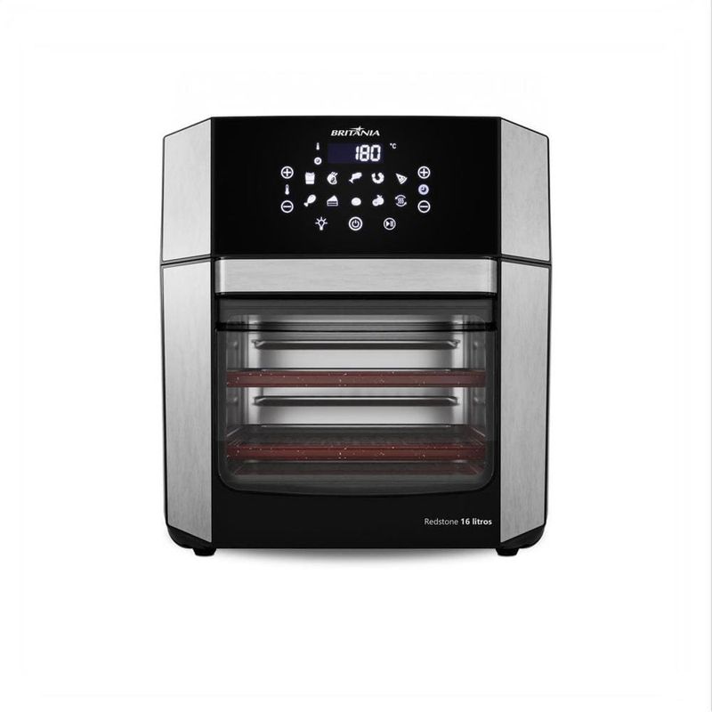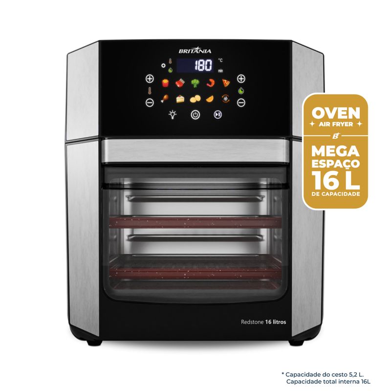 Além de ser eficiente no preparo dos alimentos, a Air Fryer Britânia se destaca pela praticidade. Seu visor transparente permite acompanhar o progresso da receita sem a necessidade de abrir a porta, o que mantém a temperatura interna constante e agiliza o processo de cozimento. A porta removível facilita a limpeza do aparelho, tornando o uso ainda mais conveniente. Acompanha diversos acessórios, como 2 grelhas, uma bandeja coletora e um cesto de 5,5L, todos com revestimento antiaderente cerâmico Redstone, que não gruda e facilita a limpeza, além de ser mais resistente e durável.