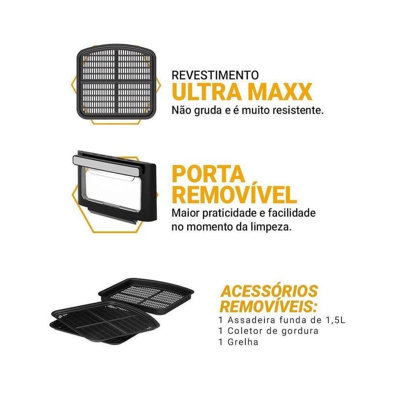 A porta com visor removível permite acompanhar o preparo sem abrir, mantendo o calor interno. Além disso, a limpeza é fácil e rápida. Com a função Programar, você define o horário do preparo e organiza sua rotina. Já a função Menu Favorito grava seus ajustes preferidos para receitas rápidas.