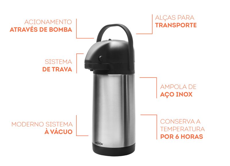 Com estrutura em alumínio que não acumula resíduos e facilita a limpeza, a Garrafa térmica de 2,5L da Brinox possui ampola de aço inox com sistema a vácuo que, conserva a temperatura da sua bebida quente ou fria por mais tempo, garantindo até 6 horas de autonomia. Seu acionamento, através de uma bomba, potencializa a pressão e facilita a saída do líquido. Além disso, a garrafa possui uma trava que garante mais segurança ao utilizar líquidos quentes. Sua alça de transporte facilita a mobilidade do produto. Nessa versão, com 2,5 L de capacidade e 22 X 15,5 X 35,5 cm de dimensão.