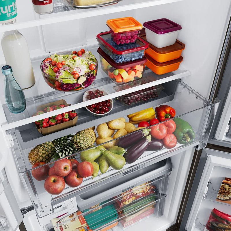 A gaveta Fresh Box preserva frutas e legumes frescos por até 15 dias, enquanto o Carbon AirFilter elimina odores indesejáveis. Com Smart Cold e Smart Flow, a temperatura é controlada com precisão e distribuída igualmente, mesmo com abertura frequente das portas.
