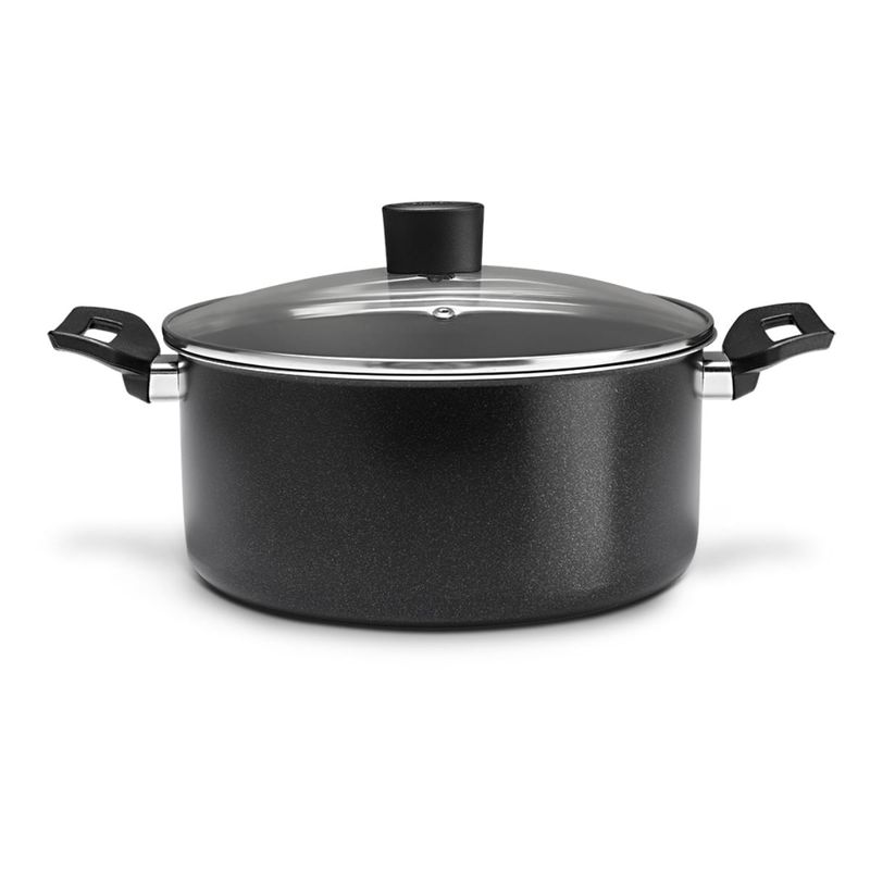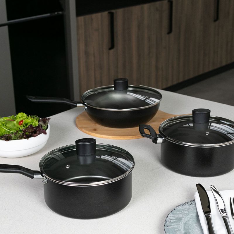Os cabos e alças em baquelite antitérmico garantem manuseio confortável e seguro, mesmo com uso prolongado. O acabamento em preto poliéster com brilho discreto confere ao conjunto um visual elegante, que se adapta facilmente a diferentes estilos de cozinha.