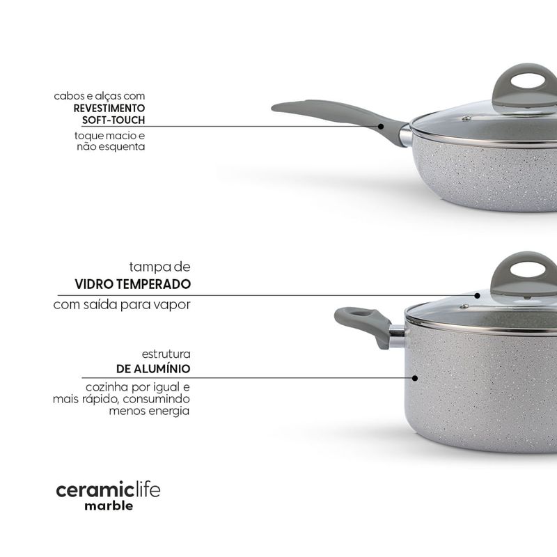 Jogo de Panelas Brinox Antiaderente Ceramic Life 5 Peças Marble Blend com Indução Cinza Claro