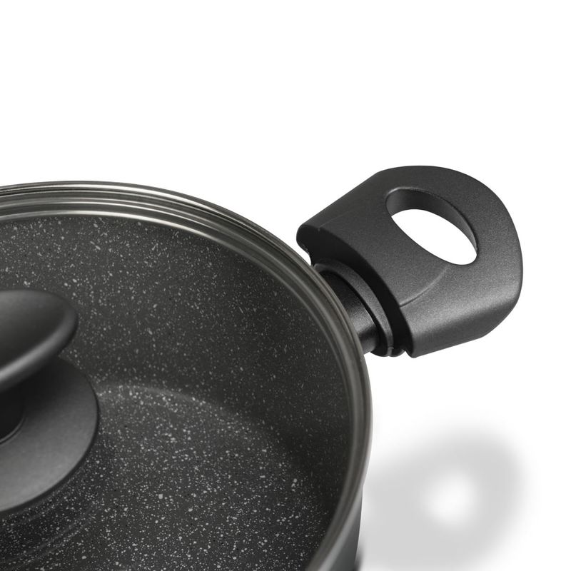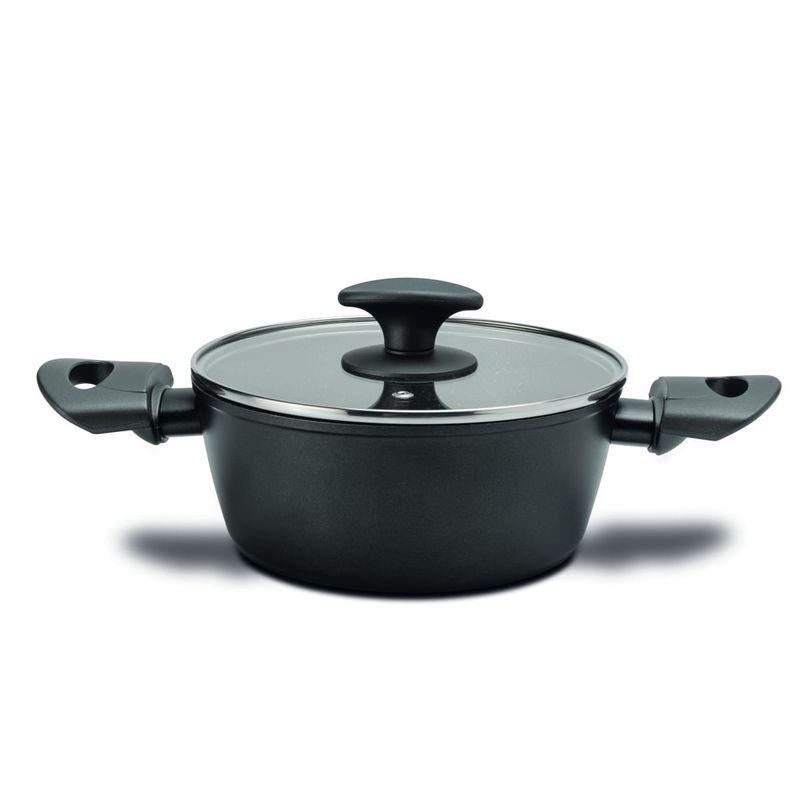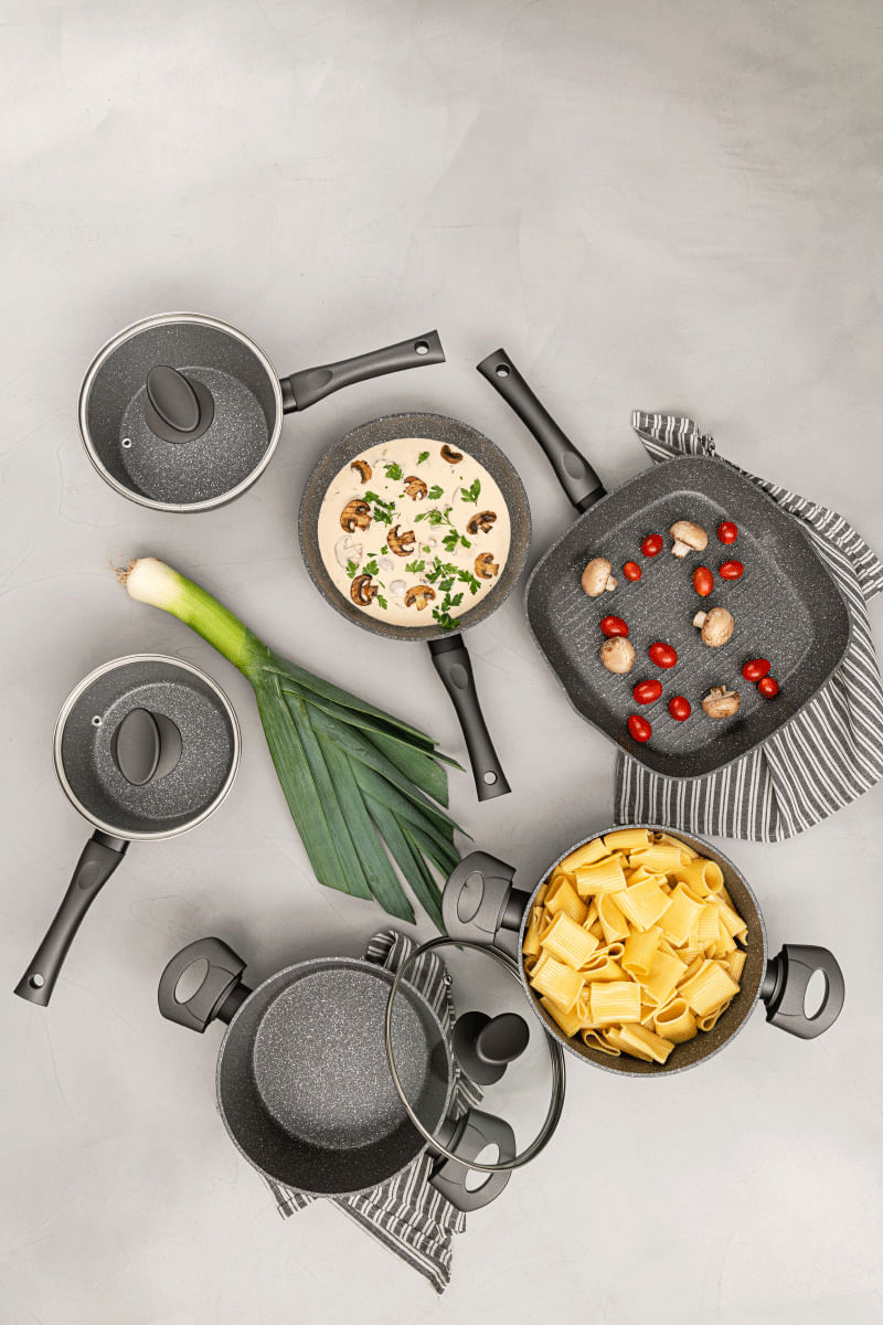 o Jogo de Panelas Brinox Antiaderente Ceramic Life 5 Peças Orion é fabricado na cor preta com estrutura em alumínio de 3 mm de espessura, que cozinha por igual, mais rápido e consome menos energia. A tampa flat é de vidro temperado, com saída para o vapor, o que torna a experiência de cozinhar ainda mais fascinante. Os cabos e alças são fabricados em soft-touch na cor preta. Livre de PFOA, o revestimento interno é com antiaderente Mineral Resist.