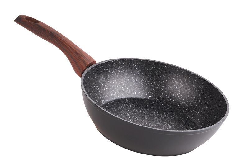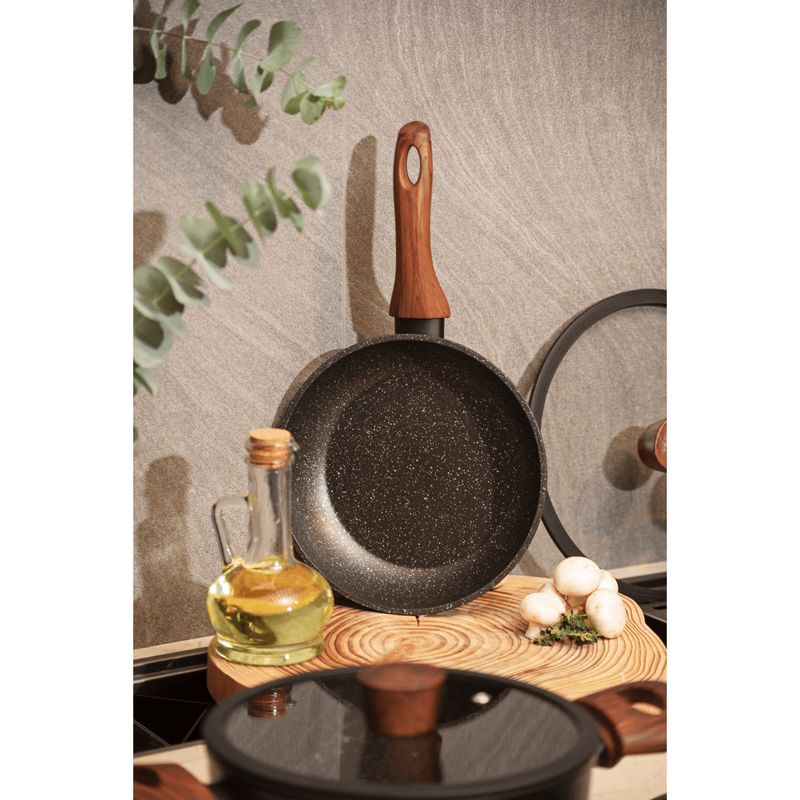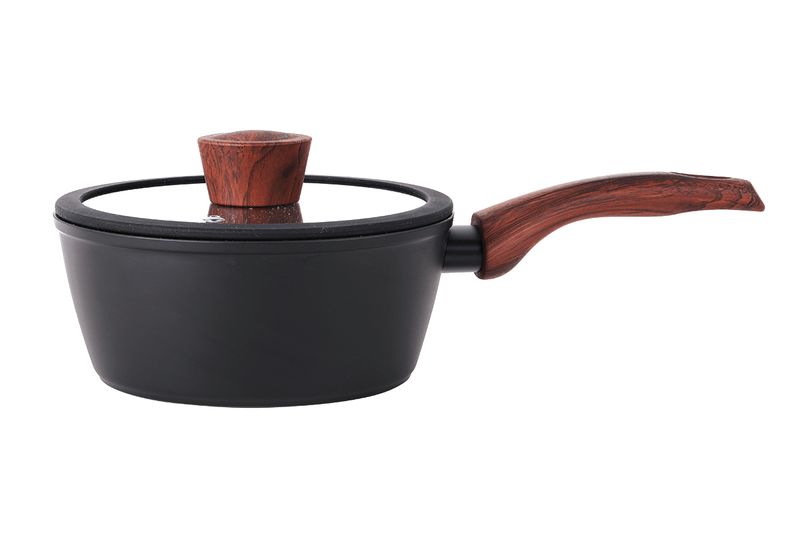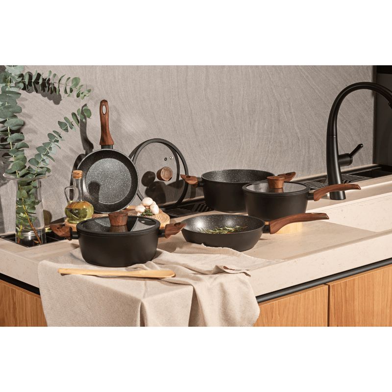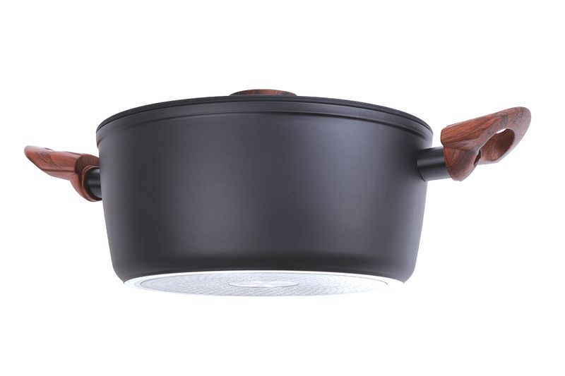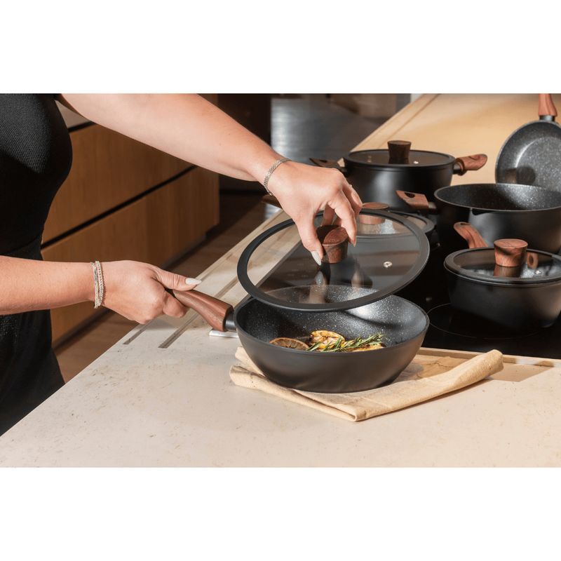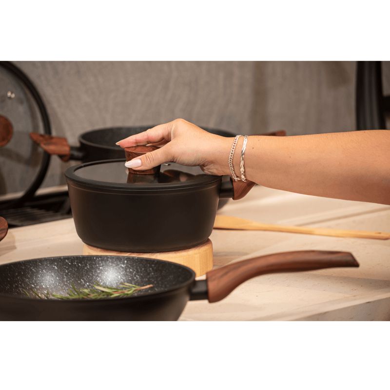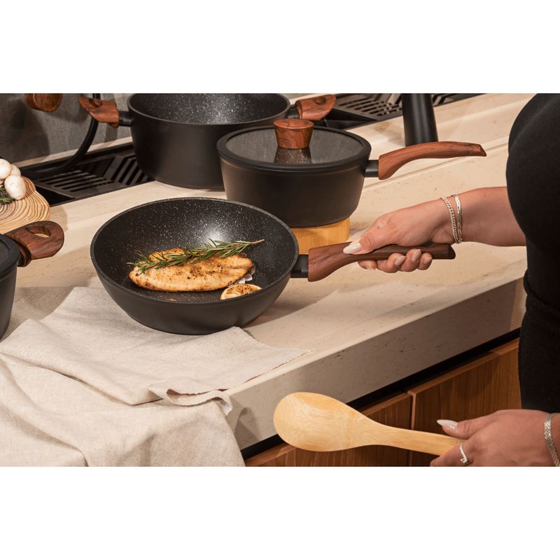 As alças e cabos, com acabamento amadeirado e toque soft-touch, possuem tecnologia antitérmica, evitando o aquecimento excessivo e proporcionando mais segurança durante o manuseio. Além disso, o acabamento externo preto fosco e o interior marmorizado conferem um visual sofisticado e moderno ao conjunto, que se adapta perfeitamente a qualquer estilo de cozinha.