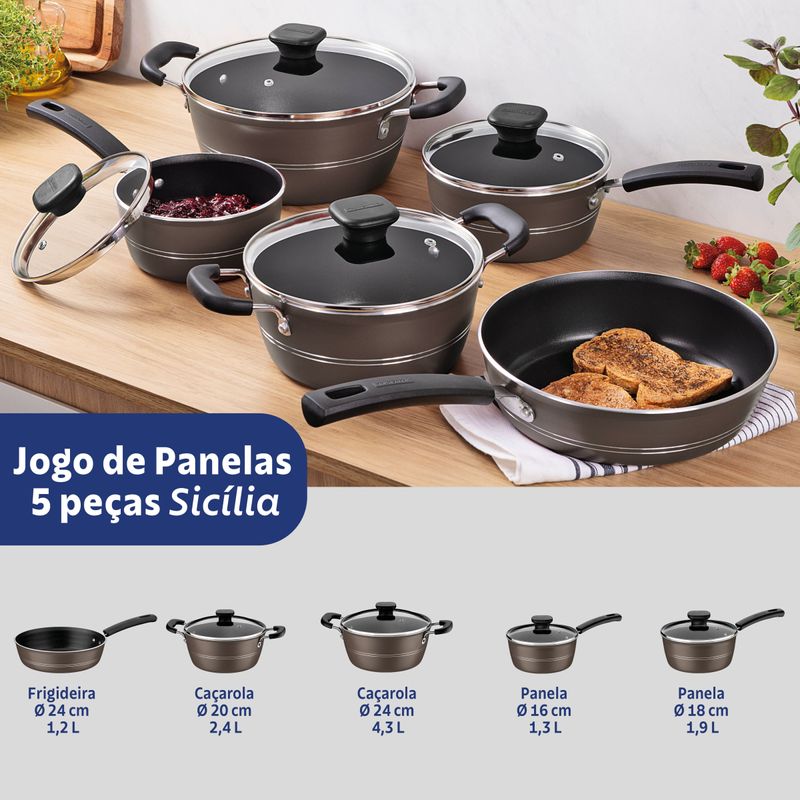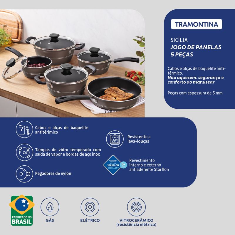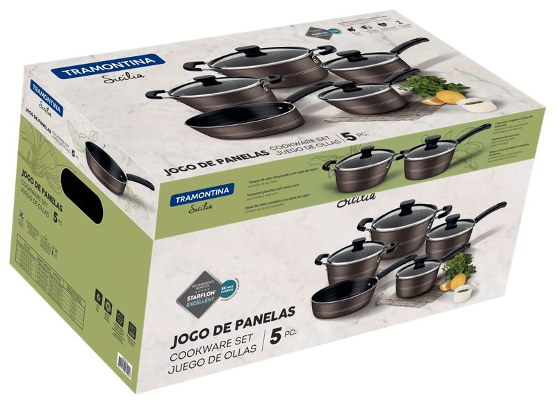 Beleza, funcionalidade e praticidade na sua cozinha com o Jogo de Panelas Tramontina Sicilia. Composto por 5 peças em alumínio com revestimento antiaderente Starflon Excellent, ele garante um cozimento uniforme e evita que os alimentos grudem, tornando o preparo das refeições muito mais eficiente.Segurança e conforto no manuseio graças aos cabos, alças e pegadores antitérmicos, que protegem suas mãos do calor e oferecem firmeza durante o uso. As panelas e caçarolas acompanham tampas de vidro temperado com borda de aço inox e saída de vapor, permitindo visualizar os alimentos sem abrir a tampa e mantendo o calor durante o preparo.Facilidade no uso e na limpeza é outro destaque do Jogo Tramontina Sicilia. As peças são práticas, resistentes e ideais para o dia a dia, tornando o momento de cozinhar mais leve e prazeroso. Prepare receitas deliciosas com mais agilidade e menos esforço.