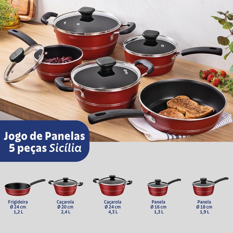 Facilite sua rotina na cozinha com o Jogo de Panelas Tramontina Sicilia. Ideal para quem busca praticidade, beleza e eficiência, esse conjunto com 5 peças é produzido em alumínio de alta qualidade e conta com revestimento antiaderente Starflon Excellent, que garante um cozimento uniforme e evita que os alimentos grudem, tornando o preparo muito mais simples e rápido.Visualize o preparo sem perder calor com as tampas de vidro temperado, que possuem borda em aço inox e saída de vapor. Essa combinação oferece mais controle e segurança durante o uso, além de agregar sofisticação ao conjunto.Segurança e conforto no manuseio são garantidos pelos cabos, alças e pegadores antitérmicos, que protegem suas mãos do calor e tornam o uso diário mais agradável. São detalhes pensados para facilitar sua experiência na cozinha.Fácil de limpar e usar, o Jogo Tramontina Sicilia é perfeito para quem deseja descomplicar o preparo das refeições sem abrir mão da qualidade. Com design moderno e funcional, ele une requinte, simplicidade e durabilidade em cada peça.Leve já o seu e transforme sua cozinha com um conjunto que une beleza, segurança e praticidade. Surpreenda-se com a qualidade Tramontina e torne cada receita ainda mais especial.