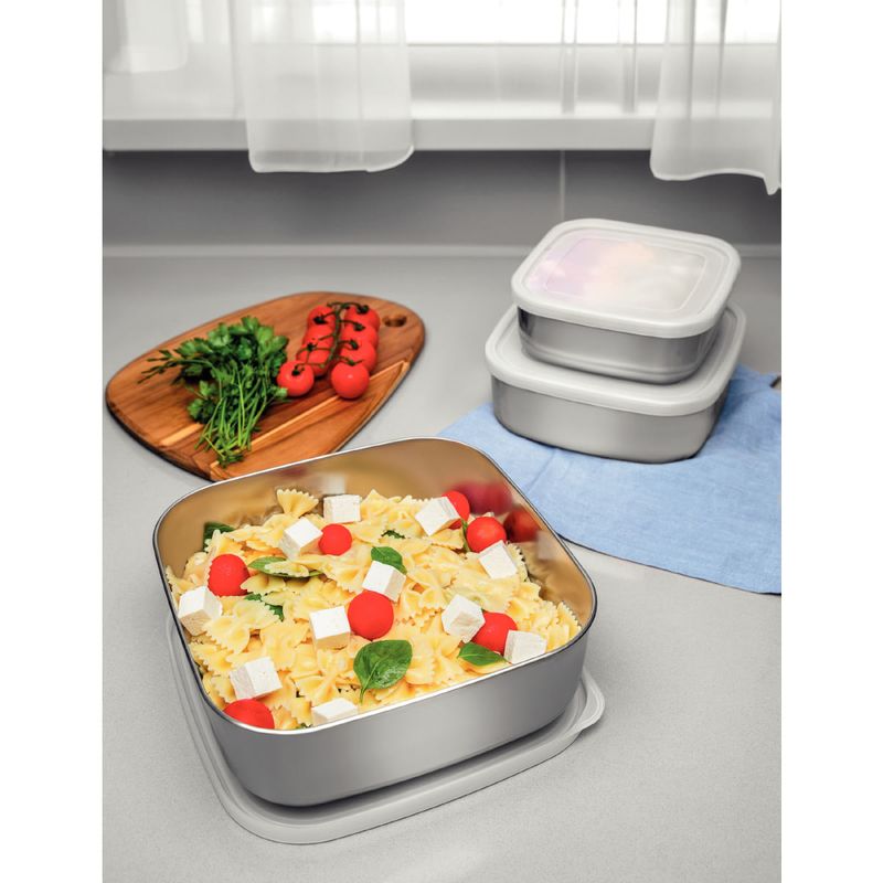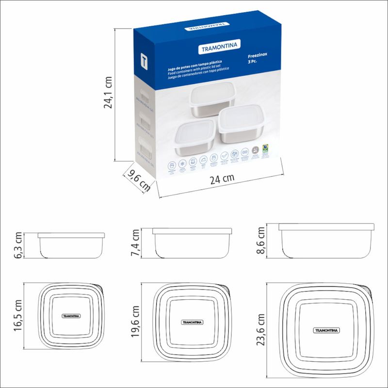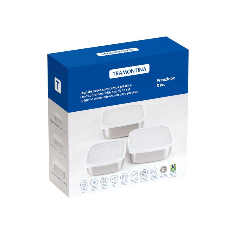 Servir bem é um verdadeiro presente para o dia a dia. O Jogo de Potes Tramontina Quadrados em Aço Inox com Tampa Plástica 3 Peças, da linha Freezinox, garante beleza e sofisticação para servir bem diariamente. Os potes são produzidos em aço inoxidável, altamente durável, mantém as características originais, preservando a beleza, a higiene e a durabilidade do material. Seu desenho limpo e sem cantos torna a limpeza muito mais fácil. Com acabamento fosco, a tampa possui vedação perfeita para a boa conservação dos alimentos. Ideal para preparar e armazenar os alimentos, podem ir à geladeira ou ao freezer. Podem ser lavados diariamente na máquina de lavar louças. Lindos e super práticos.