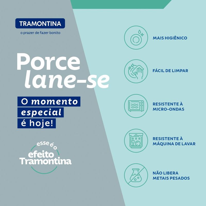 Os produtos Tramontina Porcelana completam as suas refeições e agregam muito mais beleza a sua mesa. De porcelana Tradicional e exclusiva Tramontina, que é translúcida, tem excelente brancura e brilho, alta resistência mecânica e porosidade próxima de zero, são a escolha ideal para compor uma decoração diferenciada e cheia de estilo!