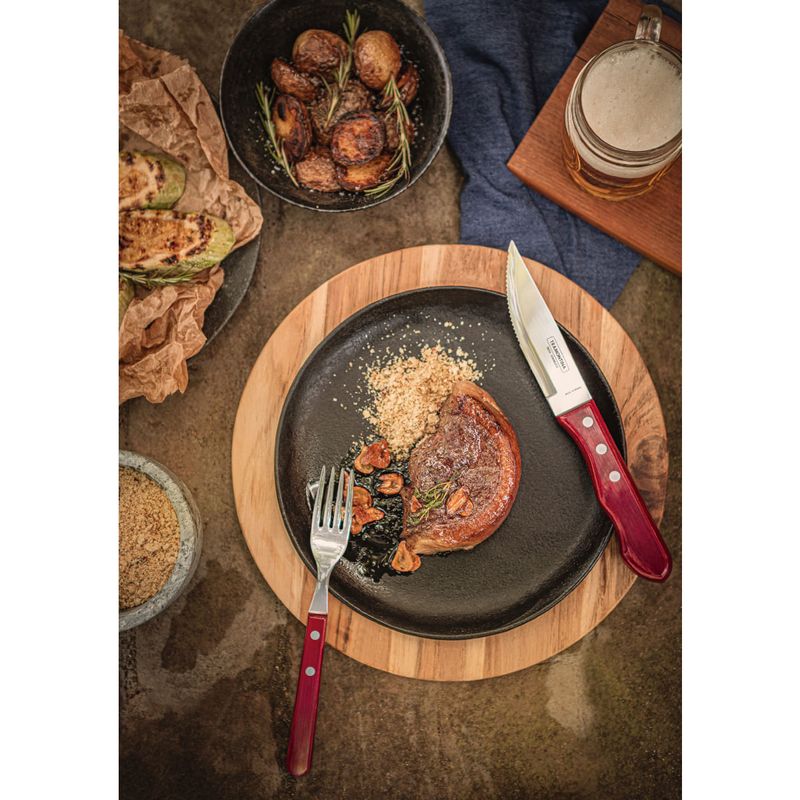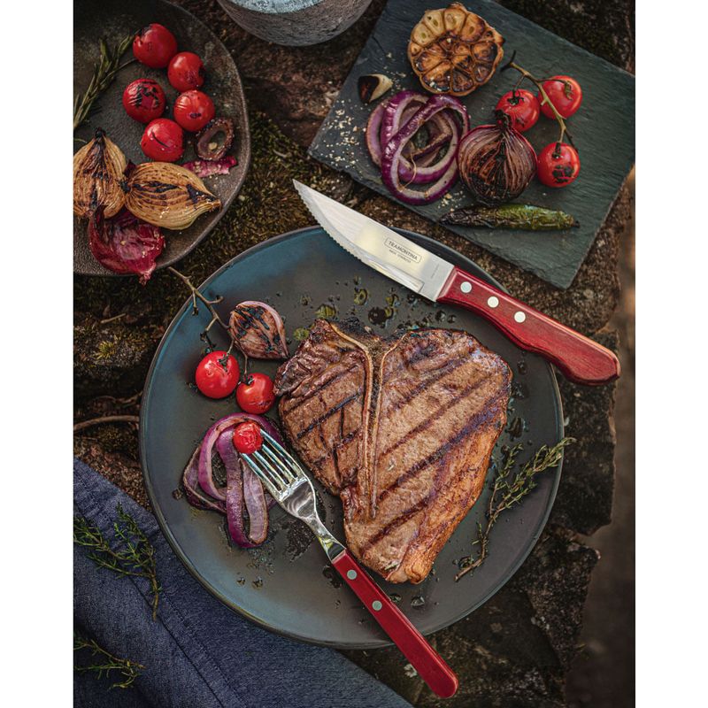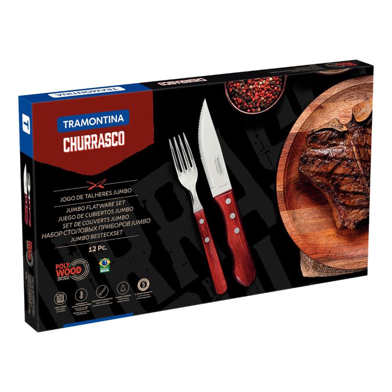 Para todo bom churrasqueiro tornar o seu churrasco ainda melhor a dica é: Jogo de Talheres para Churrasco Jumbo Tramontina em Aço Inox com Cabo Vermelho Polywood 12 Peças. O jogo da linha Churrasco é produzido com lâminas em aço inox, altamente durável, com cabos de madeira tratada Polywood, oferecendo resistência à impactos e altas temperaturas. A escolha ideal para quem busca por cortes de qualidade e peças com um design exclusivo, garantindo a beleza da mesa.