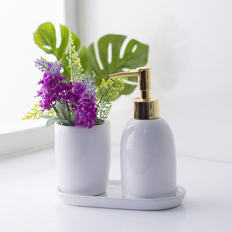 3 Peças Essenciais: O conjunto inclui um porta sabonete líquido de 220ml, uma bandeja elegante e um porta escova de dentes, atendendo às necessidades do dia a dia.