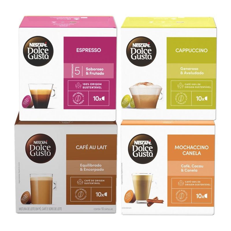 O Combo Queridinhos NESCAFÉ® Dolce Gusto® foi pensado para quem quer ter sempre o sabor certo à mão. Comece o dia com o Espresso de perfil saboroso & frutado, faça uma pausa cremosa com o Cappuccino, garanta praticidade com o Café Au Lait equilibrado & encorpado e finalize com o toque indulgente do Mochaccino Canela (café, cacau & canela).