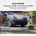 Seu motor de 1.800W garante durabilidade e ótimo desempenho, enquanto o engate rápido facilita a conexão da mangueira, prevenindo vazamentos e otimizando o uso. A lavadora também permite o uso com detergente, facilitando a lavagem de veículos, pisos e áreas com sujeiras engorduradas.